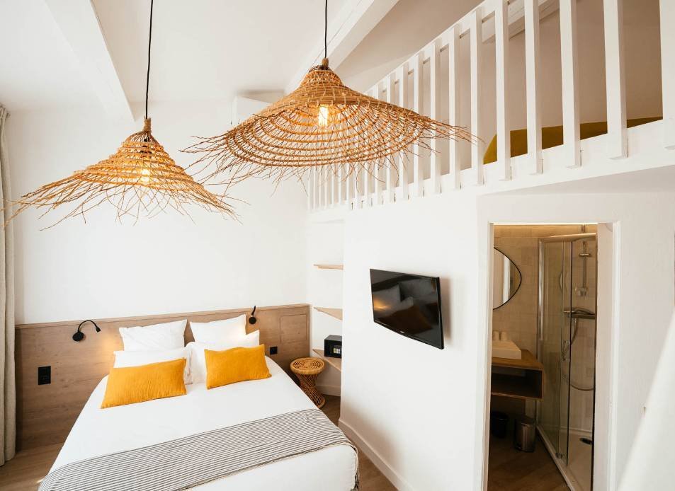 Elle dispose d'un lit King size (180x200) ou (2x90) sur demande, ainsi qu'une mezzanine en Queen size (160x200) et peut accueillir jusqu'à 4 personnes.